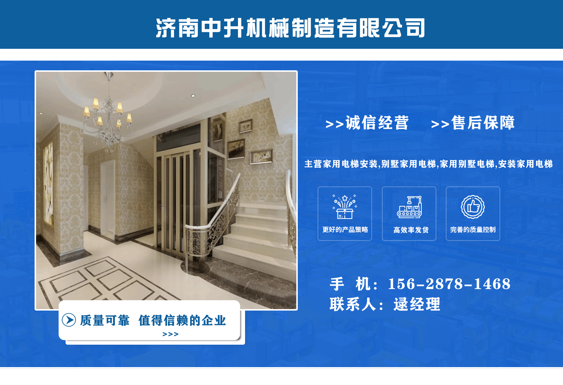 濟南中升機械制造有限公司主營家用電梯安裝,別墅家用電梯,家用別墅電梯,安裝家用電梯等業務,質量可靠,值得信賴!  公司為客戶提供免費上門測量,根據實際情況1對1服務,保障符合用戶需求,終身提供售后服務,讓用戶買的舒心用的放心。匠心團隊,打造信賴產品,我們有團結、奮進拼搏的匠心團隊,為您提供可信賴的品質保證?! 膭摿⒁詠硪恢眹栏駡绦匈|量管理體系、環境管理體系等相關標準管理體系,“顧客滿意”是我們始終如一的追求。我們有屬于自己培養的安裝隊伍,24小時服務電話,為您提供可靠的服務與支持。  我們的愿景是建設國內具有影響力的電梯公司,做城市美好空間的好伙伴。...